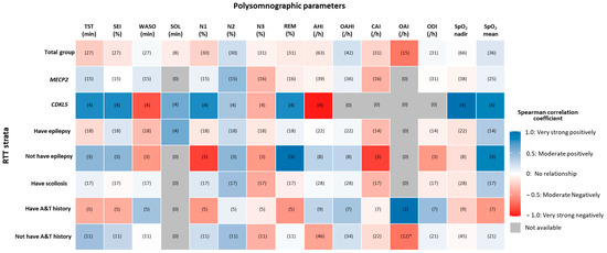 Disturbed sleep is a supportive diagnostic criteria for RTT [1], with parents and caregivers reporting sleep behaviors such as frequent night awakenings, night laughing, night screaming and difficulties falling asleep [8,9,10]. In the studies applying polysomnography (PSG), a range of sleep structure alterations in RTT have been reported, such as decreased sleep efficiency (SEI), increased number of awakenings, decreased rapid eye movement sleep (REM) and increased non-rapid movement sleep (NREM) stage 3 [11,12,13], but findings are inconsistent [14,15]. In addition, whilst the breathing disturbances during the wake state have been well investigated [16,17], respiratory findings during sleep remain dissimilar in previous studies.