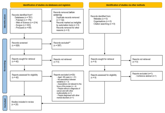 A flowchart of the literature search is shown in Figure 1. A total of 770 potentially relevant articles were identified (761 studies were identified via databases and registries, and 9 via other methods). From these, 132 duplicate articles were removed. In the next phase, titles and abstracts were analyzed, resulting in the exclusion of 587 articles. Most of the studies were excluded because they did not assess the association between sociodemographic, clinical, and psychological factors and distress in elderly people with cancer. Therefore, only 51 full texts remained for eligibility verification. Of these, 21 articles had a sample consisting of individuals under 60 years of age, and 9 articles did not assess associations between factors or assessed other associations that were not of interest to this review. One of the articles evaluated associations between the intended factors, but with a sample composed of individuals with different morbidities and not just cancer. Finally, another article was excluded, as the sample consisted of individuals with different mental disorders and not just anxiety and/or depression. No studies were excluded based on the critical assessment tools.