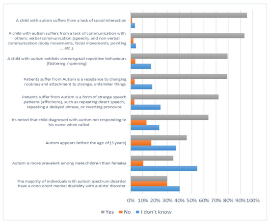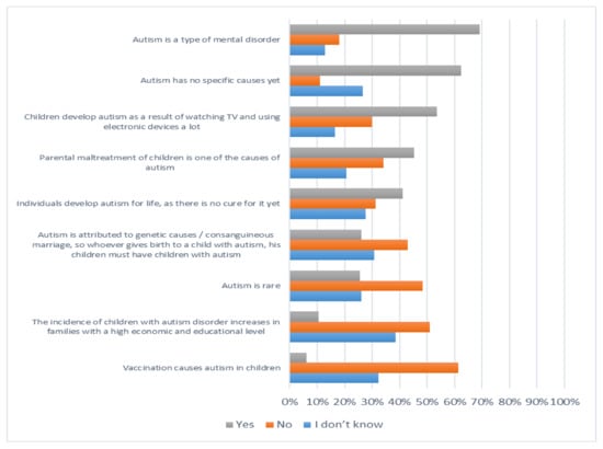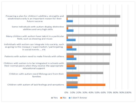 These findings are in contrast to a previous study [28] which found that not only the general population, but even certain healthcare providers and educators were unfamiliar with autism. In our study, the vast majority of participants (80.4%) reported that they had prior knowledge of ASD. The majority of them had moderate to high awareness of autistic children’s characteristics and abilities, but only a minimal understanding of the disease’s causes. These findings show a high level of knowledge when compared to a prior survey conducted in Saudi Arabia, which found that the degree of understanding was only 41% [29]. One study in Australia and another in Africa found similar results to ours; in both studies, participants had a general understanding of ASD but very little understanding of the disease’s cause [30,31]. The majority of Australians were aware of ASD, but they believed it was caused by the MMR vaccine. However, the World Health Organization (WHO) stated that there was no evidence linking any vaccine to autism [19,30]. Another study revealed a misunderstanding about the treatment, with participants believing that children with ASD are unable to attend public school [31]. As previously said, this disorder is caused by a number of variables, some of which are genetic in nature and others which are environmental in nature [15,16,17,18].