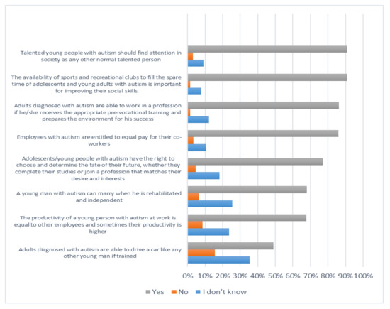 In our study, participants showed variation regarding their knowledge about autism spectrum disorder. The highest knowledge score was found for items related to knowledge of the abilities and needs of adolescents/young people and children with autism disorder and characteristics of children with autism spectrum disorder. However, the level of knowledge regarding causes of this disorder was low. ASD is caused by a combination of genetic and environmental factors. Knowing ASD risk factors is critical for reducing the likelihood of having children with ASD [1,32].