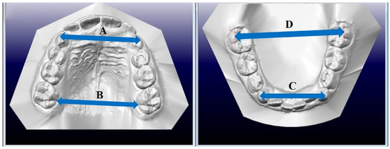 Measurement of the width of the dental arch. A—anterior width of the upper arch, B—posterior width of the upper arch, C—anterior width of the lower arch, D—posterior width of the lower arch. [Own source].