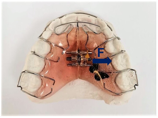 The appliances used during the treatment in the study group in the upper dental arch consisted of an acrylic plate with metal clasps surrounding the molars and screw in the midline, placed on the palate. By means of unscrewing the screw, the impact force (force F) was transferred to the periosteum, which expanded the bones in the palatal suture and then rebuilt the outer surfaces of the walls of the alveolar process (Figure 3).