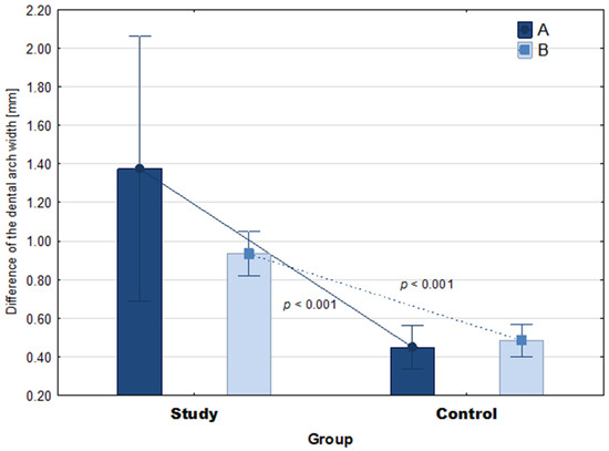 The 10-month mean difference in jaw parameters in the groups. The p-value relates to the Mann-Whitney U test and Student’s t-test. Whiskers show 95% confidence intervals. A—anterior width of the upper arch, B—posterior width of the upper arch.