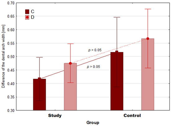 The 10-month mean difference in mandible parameters in the groups. The p value relates to the Student’s t-test. Whiskers show 95% confidence intervals. C—the anterior width of the lower dental arch; dimension D—the posterior width of the lower dental arch.
