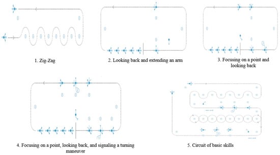 The bicycle training course has been previously described [47]. Briefly, it comprised three parts: (a) an awareness-raising session on the use of the bicycle in the city (1 h), in which participants became aware of the advantages and disadvantages of cycling and road traffic regulations; (b) a session in a closed traffic circuit and a 15-min break (2 h), with the aim of developing basic skills for handling and controlling the bicycle (Figure 1); and (c) a session in an urban circuit, in real traffic conditions (3 h), where they applied the learned skills for riding the bicycle to a real context (Figure 2).