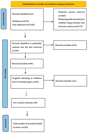 This search strategy was run on 13 January 2021 in seven electronic databases: (Medline, CINAHL, Embase, PsycINFO, HMIC, Social Care Online, and Web of Science Core Collection) and a total of 4753 papers were identified. Grey literature relating to policy and organisational-based material was also searched between 20–24 January 2021 (MedRxiv, PDQ-Evidence, NICE Evidence Search, LTCCovid19.org and TRIP) and 13,488 articles were identified. After removing the 1465 duplicates from these 18,241 documents, 16,776 articles remained, and the titles and abstracts were screened independently by two reviewers using the inclusion and exclusion criteria. These were: the literature needed to address COVID-19 or other infectious and contagious diseases in older people (aged 65 years and over) living in CHs, nursing homes, long-term facilities, or residential CHs. No limits were placed on the geographical location, but only English-language articles were included because of the resources available. 145 abstracts were identified as potentially relevant, and these papers were independently reviewed in full by four reviewers using the inclusion and exclusion criteria to make a recommendation: ‘Include’; ‘Exclude’; ‘Unsure—need to conduct full text screening’ (each paper was reviewed by two reviewers and any conflict in the assessments were resolved in collaboration with a third reviewer). 94 records were included in the review. Targeted searching of the reference lists of these 94 papers highlighted a further 10 papers, which were again reviewed independently by two reviewers, and nine were included in the review. Thus, a total of 103 papers were included in the review [,,,,,,,,,,,,,,,,,,,,,,,,,,,,,,,,,,,,,,,,,,,,,,,,,,,,,,,,,,,,,,,,,,,,,,,,,,,,,,,,,,,,,,,,,,,,,,,,,,,,,,] (see Table 1 for a description of each paper), and 52 papers were excluded [,,,,,,,,,,,,,,,,,,,,,,,,,,,,,,,,,,,,,,,,,,,,,,,,,,,].