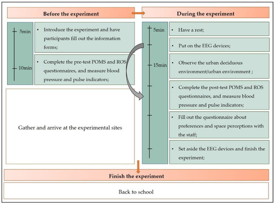 The experiment was divided into three phases (Figure 2). First, all participants took a pretest in a classroom at Sichuan Agricultural University, which included questionnaire completions and physiological measurements (classroom temperature 22–26 °C and classroom humidity 49–55%). The questionnaire included key sociodemographic characteristics and two psychological state scales (Profile of Mood States, POMS, and Restorative Outcome Scale, ROS), and the physiological measurements included blood pressure, blood oxygen, and pulse rate. The participants then traveled to the experimental sites (approximately 30 min from the school) in a university vehicle. When the participants arrived, they sat quietly for 5 min to eliminate external influences [44,45] before being led by staff on a walk to the two deciduous forest environments and the control environment to begin a simultaneous 15-min viewing activity. An EmotivPRO device was used to simultaneously record participant electroencephalogram (EEG) data. The volunteers were asked to experience the environment quietly, without using cell phones, talking, eating or drinking. After 15 min, the EEG instrument was removed and physiological and psychological measurements were repeated. Subsequently, preference and spatial perception questionnaires were completed, and the volunteers were brought back to the university by staff, ending the experiment. The entire experiment was completed over three days (3–5 November 2020), starting each day at 9:00 a.m. The environmental factors of the two experimental and control groups were measured every 2 h using a black sphere thermometer (AZ8778), a noise meter (CEN-TER322), and a digital photometer (T-1H, Minolta, Osaka, Japan) (Table 1).