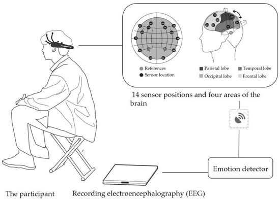 EEG is used to record changes in electrical waves during brain activity [49]. It is recorded using neuroharmonic EEG biofeedback techniques [50,51] and widely used as emotional feedback in restorative research [52]; it is noninvasive to humans. The EEG recorder Emotiv EPOC+ device used in this study is a noninvasive EEG signal acquisition instrument with an internal signal sampling frequency of 1024 Hz and an internal sampling frequency of 128 Hz per channel; the instrument is worn so as to cover four brain lobe regions (i.e., the frontal, temporal, parietal, and occipital lobes) using 14 channels (AF4, AF3, F3, F4, F7, F8, FC5, FC6, T7, T8, P7, P8, O1, and O2) for recording [39]. After a subject dons the device, the output of the four brain lobe regions with respect to six emotional (“engagement”, “excitement”, “stress”, “relaxation”, “interest” and “focus”) is collected. These parameters objectively reflect the emotional feedback of the subject in response to different environmental stimuli [53] (Figure 3).