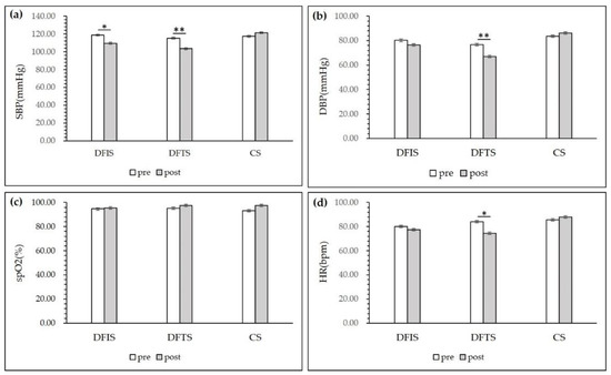 Systolic blood pressure, diastolic blood pressure, peripheral oxygen saturation, and heart rate of the participants after the experiment in the three stimulating environments: (a) Systolic blood pressure change; (b) Diastolic blood pressure; (c) Peripheral oxygen saturation change; (d) Heart rate change. (n = 120; mean ± SD; * p < 0.05; ** p < 0.01; verified by a paired t-test, DFIS: deciduous forest interior setting; DFTS: deciduous forest trail setting; CS: city setting).