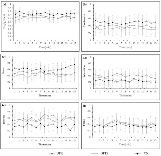 Figure 5 shows the differences in the mean values of the neuroemotional parameters between the groups after 15 min of viewing in the different environments. Compared with the control group, the six indices of affective parameters in the DFTS group were significantly different, and there were significant differences in “engagement”, “stress”, and “interest” between the DFIS group and the control group. Regarding the two experimental groups, the DFIS group scored significantly higher than the DFTS group on the indicators of “engagement”, “stress”, “excitement”, and “interest”. “Focus” was significantly lower in the DFIS group compared to the DFTS group, and the “Relaxation” indicator was not significantly different. Figure 6 shows the minute-by-minute changes in the six emotional parameters during the viewing period. One minute after the start of measurement, all three groups displayed significant changes in their emotional parameters. In the CS group, the values of “engagement”, “excitement”, and “stress” were higher than those of the two experimental groups, while the values of “relaxation”, “interest”, and “focus” were lower than those of the two experimental groups, which is consistent with the results of the comparison between groups. The fluctuation of the EEG emotion parameters in the DFTS group and CS group was greater than in the DFIS group.