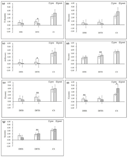 POMS scores before and after the three stimulating environments: (a) T-A scores change; T-A: tension-anxiety; (b) D scores change; D: depression; (c) A-H scores change; A-H: anger-hostility (d) V scores change; V: vigor; (e) F scores change; F: fatigue; (f) C scores change; C: confusion; (g) S scores change; S: self-esteem; (n = 120; mean ± SD; * p < 0.05; ** p < 0.01, verified by Wilcoxon signed-rank test; DFIS: deciduous forest interior setting; DFTS: deciduous forest trail setting; CS: city setting).