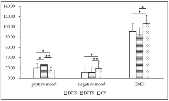 Mood state values for the three stimulating environments (n = 120; mean ± SD; * p < 0.05; ** p < 0.01; verified by Wilcoxon signed-rank test; DFIS: deciduous forest interior setting; DFTS: deciduous forest trail setting; CS: city setting; “TMD” means “total mood”).