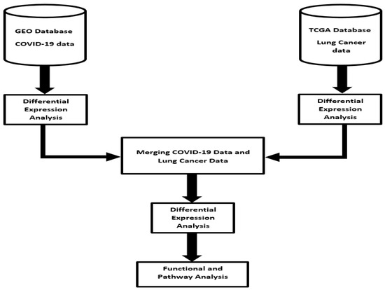 Project design and integrated data analysis workflow of gene expression data from COVID-19, lung cancer and normal lung samples. RNA-Seq data sets were downloaded from the Gene Expression Omnibus (GEO) and The Cancer Genome Atlas (TCGA).
