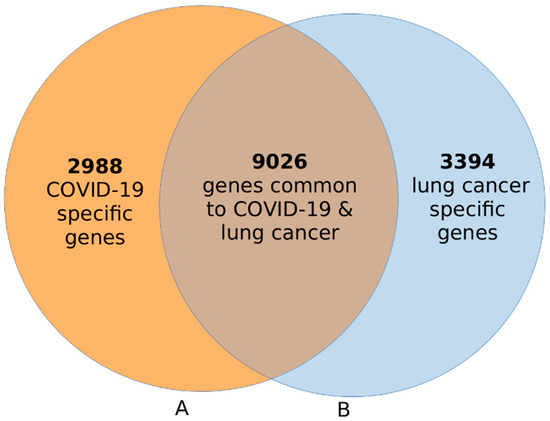Venn diagram showing signatures of genes uniquely associated with COVID-19 ((A), orange) and a signature of genes associated with lung cancer ((B), blue). A signature of 9026 genes associated with both diseases is shown in the intersection.