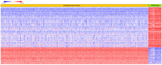 Patterns of expression profiles for the top 515 upregulated and downregulated genes in lung cancer and in COVID-19, generated using hierarchical clustering on genes associated with both diseases. Genes are represented in rows, and lung cancer and COVID-19 samples in columns. Red color indicates upregulation and blue represents downregulation.