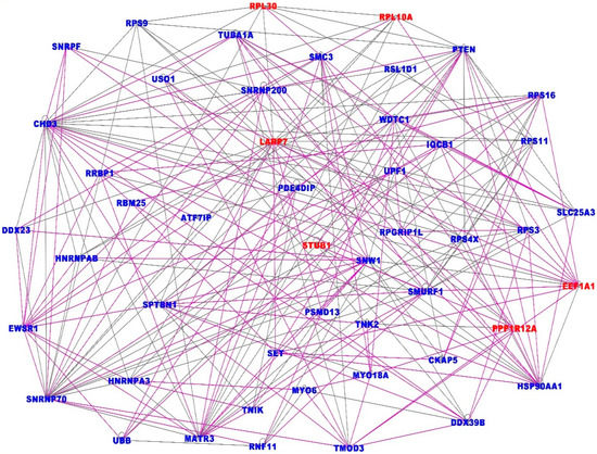 Highly interconnected gene regulatory networks associated with both COVID-19 and lung cancer. The gene names in red font indicate upregulation and blue font downregulation. The solid lines indicate overlapping functions between the genes in the seven merged networks.