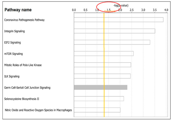 The results showing the top nine most highly significant signaling pathways associated with both COVID-19 and lung cancer are presented in Figure 5. The top pathways discovered included: the Coronavirus Pathogenesis signaling pathway -log(p-value, 3.87E), which contained the genes DDIT3, E2F6, EEF1A1, RPS11, RPS16, RPS3, RPS4X, RPS9, SERPINE1, STING1, SUV39H1, TGFBR2; the Integrin signaling pathways -log(p-value, 3.51E), containing genes FNBP1, PAK2, PARVA, PARVB, PIK3R2, PLCG2, PPP1R12A, PTEN, RHOD, RND3, TLN2, TNK2, TSPAN3, TTN; the EIF2 signaling pathways -log(p-value, 3.29E), containing genes DDIT3, EIF1, PIK3R2, PPP1CA, RPL10A, RPL22L1, RPL30, RPL32, RPL36, RPS11, RPS16, RPS3, RPS4X, RPS9; the mTOR signaling -log(p-value, 2.58E), containing genes FNBP1, PIK3R2, RHOD, RICTOR, RND3, RPS11, RPS16, RPS3, RPS4X, RPS6KA1, RPS9, ULK1.