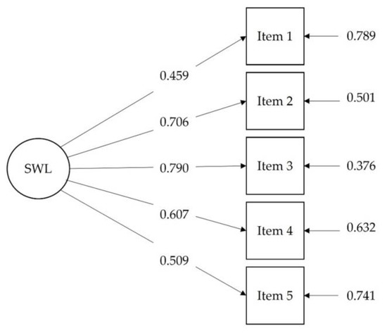 Path model for the Confirmatory Factor Analysis of the Satisfaction with Life Scale (SWLS), with factor loadings and residuals. Standardized coefficients are shown.