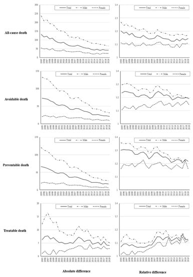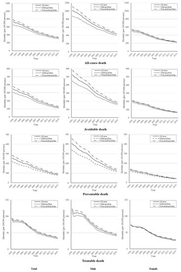 The following supporting information can be downloaded at: https://www.mdpi.com/article/10.3390/ijerph19063475/s1, Table S1: Age standardized all-cause mortality rates per 100,000 persons (95% confidence interval) of metropolitan and non-metropolitan areas by sex from 1995 to 2019, Table S2: Age standardized avoidable mortality rates per 100,000 persons (95% confidence interval) of metropolitan and non-metropolitan areas by sex from 1995 to 2019, Table S3: Age standardized preventable mortality rates per 100,000 persons (95% confidence interval) of metropolitan and non-metropolitan areas by sex from 1995 to 2019, Table S4: Age standardized treatable mortality rates per 100,000 persons (95% confidence interval) of metropolitan and non-metropolitan areas by sex from 1995 to 2019, Table S5: Absolute and relative changes of cause-specific avoidable mortality rate according to the type of areas from 1995 to 2019 in males, Table S6: Absolute and relative changes of cause-specific avoidable mortality rate according to the type of areas from 1995 to 2019 in females, Table S7: Absolute and relative differences of all-cause and avoidable mortality between metropolitan and non-metropolitan areas from 1995 to 2019, Table S8: Absolute and relative differences of preventable and treatable mortality between metropolitan and non-metropolitan areas from 1995 to 2019.