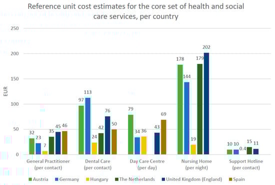 A key motivation behind the Horizon 2020-funded European research project ProgrammE in Costing, resource use measurement and outcome valuation for Use in multi-sectoral National and International health economic evaluAtions (PECUNIA; 2018–2021) [22] was to establish internationally comparable RUCs. The PECUNIA project spanned six European countries (Austria, Germany, Hungary, The Netherlands, England/UK, and Spain) and was coordinated by the Medical University of Vienna. While some European countries have published freely accessible unit cost lists for health and social care services on the national level (e.g., The Netherlands [23,24,25,26], UK [27,28,29], Germany [30,31,32]), an up-to-date international, multi-country and multi-sectorial harmonized collection of reference unit cost estimates is currently not available. For example, the Health Benefits and Service Costs in Europe (HealthBasket) project (2004–2007) produced unit costs associated with the delivery of care for a total of ten inpatient and outpatient services in nine countries but concluded that a comparable methodology for this was not available [33]. Most recently, the European Healthcare and Social Cost Database (EU HCCD) established a set of available unit costs for nine countries in the healthcare sector, productivity losses, and informal care costs, but its focus was on the synthesis of existing unit costs rather than their comparability.