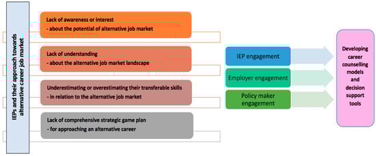 Alternative careers allow IEPs to regain their professional identity, which may have been lost in the migration process []. For example, by becoming a health policy analyst, an IEP can utilize their knowledge of healthcare services and disease prevention, have excellent career prospects, and contribute to the healthcare system and economy of the host country. There are numerous impediments to the facilitation of IEPs into alternative careers. Challenges exist both at the IEP and system level, but IEP-level barriers seem to be the most challenging as well as the most comprehensively unexplored (Figure 1).