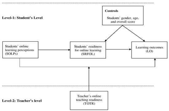 Michotte [33] argued that perception plays an important role in shaping the actions to adjust to the world where we live. The perception depicts a motivational force that influences learners’ motivational state towards online learning [16] and facilitates them to develop self-efficacy, positive emotions and undertake activities to accomplish outcomes [34]. Online learning during COVID-19 contributes to the intrinsic and extrinsic motivation of the students in such a manner that students view the online learning system as a way to gain knowledge and skills and complete their studies on time to embark on a professional career. Therefore, students’ positive perceptions of online learning foster their readiness to gain and develop essential competencies to adopt online learning [9]. Literature has also showed that readiness for online learning is associated with LO and course satisfaction [13,35]. The students who possess technology-related knowledge and skills, and have high confidence, are more likely to engage in online learning for achieving outcomes [9]. A recent study reported that SRFOL mediated the relationship between online learning perceptions and course performance and satisfaction [13]. Thus, in the light of the above discussion, we expect that: