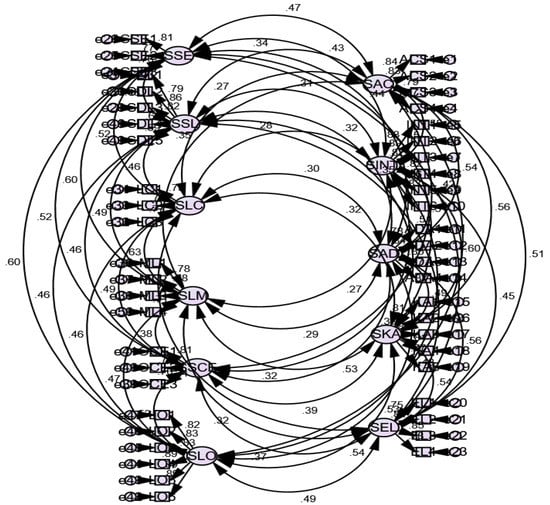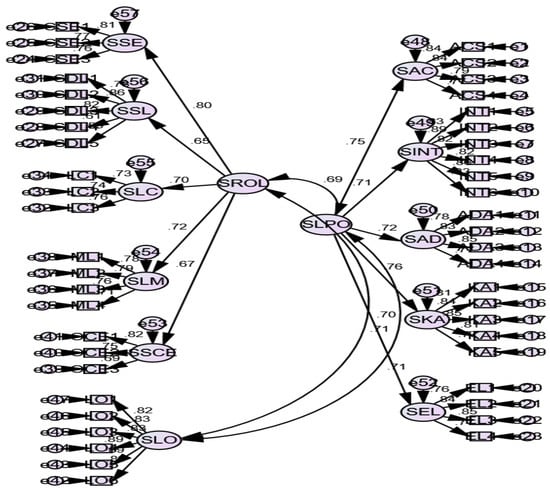 Next, we specified a second-order measurement model comprising three factors: SOLPs, SRFOL (second-order constructs), and LO (Figure 3).