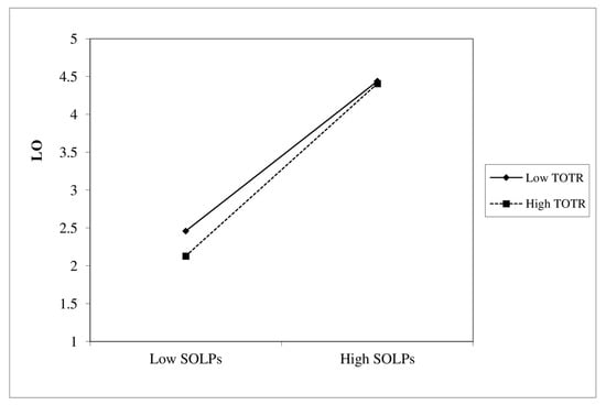 The TOTR was conceptualized as a level-2 variable. We tested the level-2 hypothesis in HLM (Table 6). The interaction term of SOLPs and TOTR was computed by multiplying their scores. In HLM, the effects of SOLPs, TOTR, and interaction terms were specified, and the results were obtained [43]. The results show that SOLPs significantly and positively affected the LO (γ = 0.99, p < 0.01). The results also showed that the interaction term of SOLPs and TOTR significantly and positively affected the LO (γ = 0.15, p < 0.01). The results supported the moderating effect hypothesis (H5).