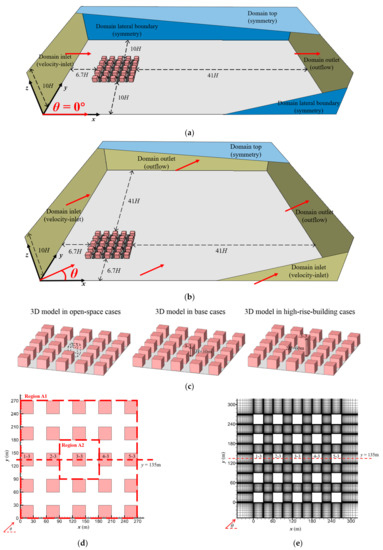 Figure 1a depicts the simulation area of the cases with parallel approaching wind (θ = 0°), with the geometry of 1700 m (x) × 870 m (y) × 300 m (z). The distances from the UCL model to the domain inlet, outlet and lateral boundaries are 6.7H, 41H and 10H, respectively. The symmetry boundary condition is adopted at the domain top and the lateral boundaries, while the domain outlet takes the zero normal gradient boundary condition [39,69,70].