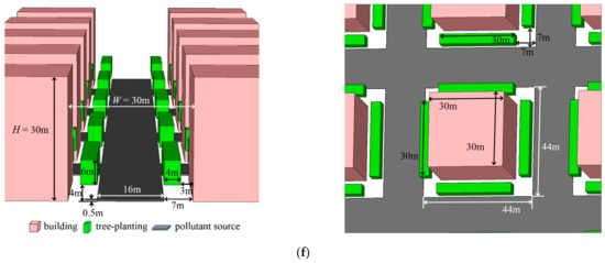 Scientists have found that traffic emissions have critical negative impacts on respiratory and cardiovascular function [73,74]. The situation in Asian cities might be more severe due to the very high population density and more residents living in close proximity to road traffic compared with those in European cities. To model the dispersion of traffic-related pollutants in the street canyon, reactive gaseous as primary particles [75], inert gas like CO [76], as well as reactive gaseous pollutants such as NOx and VOCs [77] are adopted in the simulation for investigating the dispersion of traffic-related air pollutants. Unlike various studies focusing on the reactive compounds from traffic such as NOx, VOCs and particles, we adopted monoxide (CO) as an indicator of the traffic emissions. Although NOx, VOCs and particles have more significant health impacts than CO, these compounds are more or less chemically or photo-chemically reactive, which means they could not be used as a tracer for the variation of the traffic emissions. To numerically investigate the impacts of various urban layouts on the physical dispersion of the traffic-related pollutants and related human exposure, a stable indicator is needed. As one of the main inert pollutants, CO has been widely used as a tracer of traffic emissions [42,46,48]. This study mainly focuses on the dynamic dispersion of traffic pollutants influenced by different urban layouts. Deposition and chemical reactions are not considered. The CO emission source is settled from z = 0 m to 0.5 m, with a width of 16 m and is 7 m away from the kerbside building (marked with dark grey colour in Figure 1f).