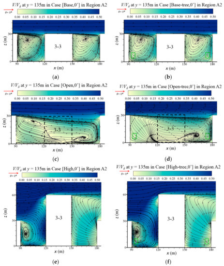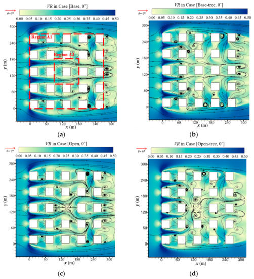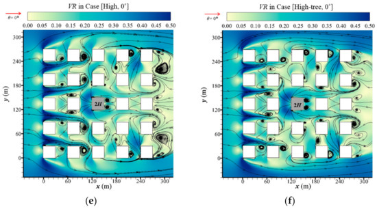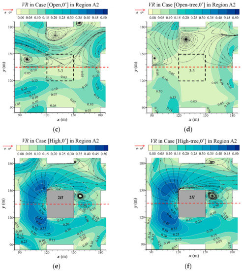 Streamline and velocity ratio (VR) at z = 2m in Region A2 in (a) Case [Base, 0°], (b) Case [Base-tree, 0°], (c) Case [Open, 0°], (d) Case [Open-tree, 0°], (e) Case [High, 0°] and (f) Case [High-tree, 0°].