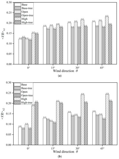 The results in Figure 5a,b and Table A5 show that tree planting reduces the VR in both Region A1 and A2 for different building configurations with all four approaching wind directions (θ = 0°, 15°, 30°, 45°), except Case [Base-tree, 0°] and Case [High-tree, 0°]. Tree planting significantly decreases the urban wind speed at z = 2 m (<VR>A1) on the basis of either open space or high-rise building designs, by 4.63–14.99% or 2.04–16.68%, respectively. The <VR>A1 with non-parallel approaching wind directions (θ = 15°, 30°, 45°) is reduced more in comparison with parallel approaching wind (θ = 0°). Taking Case [High-tree, θ] as an example, <VR>A1 is decreased by 6.87–16.68% compared with Case [High, θ] when θ ≠ 0°, more than the 2.04% when θ = 0°. These results are also consistent with the results presented in Figure 2, Figure 3, Figure 4 and Figure 5. Contrary to the reductive effect of most tree-planting cases, tree planting increases the <VR>A1 of Case [Base-tree, 0°] and <VR>A2 of Case [High-tree, 0°] by 6.27% and 8.98%, respectively. This phenomenon still needs more discussion in the ongoing work.