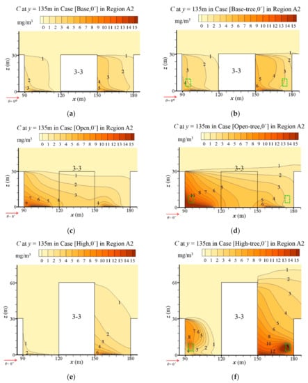Detailed vertical distributions of C surrounding Building 3-3 in the central region (Region A2) with different building configurations are illustrated in Figure 7b,d,f. Compared with Figure 7a,c,e, tree planting evidently increases the near-ground C on the leeward side of all buildings. Particularly in Case [Open-tree, 0°], the near-ground C in the upwind of the open space increases to higher than 15 mg/m3. Trees around the high-rise building also have a significant influence on CO dispersion (Figure 7f). An area with a high C appears at the upper layer of the building wall on the upwind of Building 3-3, corresponding to the vortex of the flow field in Figure 4. At the downwind of Building 3-3, the ground-level C is higher than 15 mg/m3. Moreover, another hotspot with C higher than 15 mg/m3 appears in the area of the tree crown.