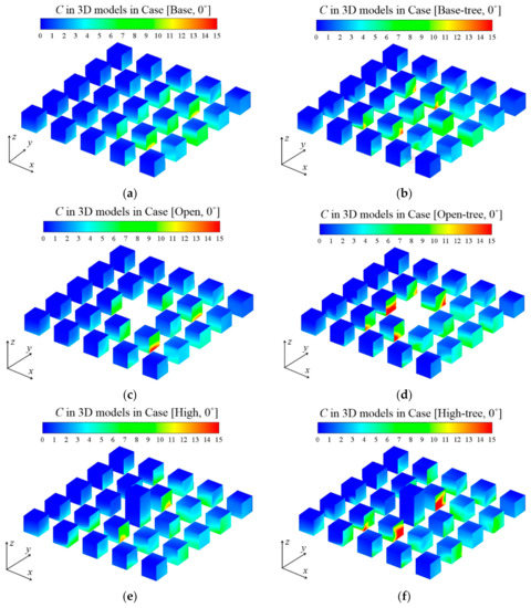 CO concentration (C) at z = 2 m in (a) Case [Base, 0°], (b) Case [Base-tree, 0°], (c) Case [Open, 0°], (d) Case [Open-tree, 0°], (e) Case [High, 0°] and (f) Case [High-tree, 0°].