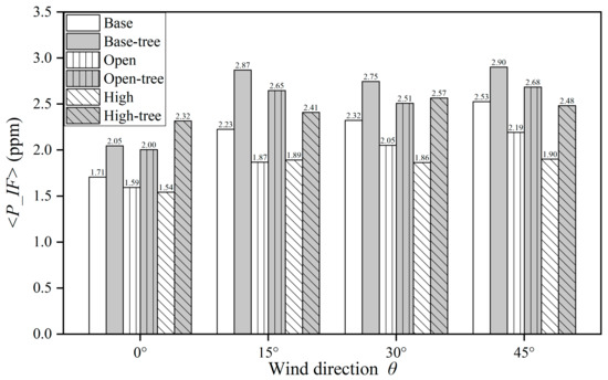 Figure 8a,b and Table A6 summarise the mean CO concentration (C) at the pedestrian level (z = 2 m) in Region A1 (<CO>A1) and A2 (<CO>A2). The impacts of three building configurations, tree planting and wind directions (θ = 0°, 15°, 30° and 45°) are quantitatively assessed.