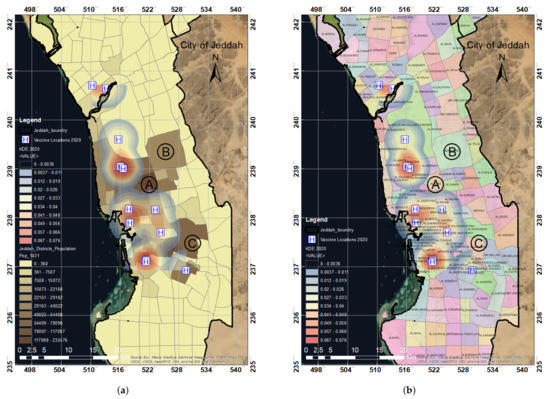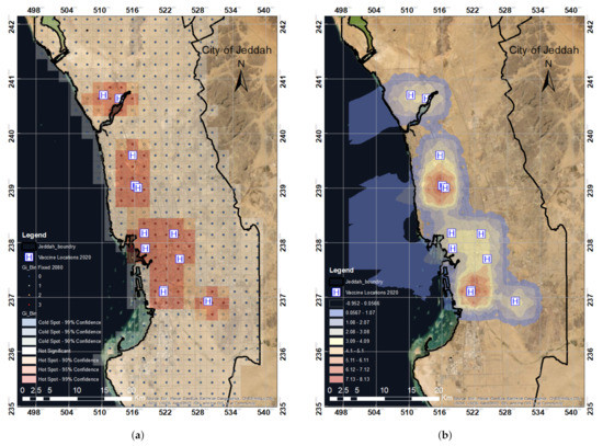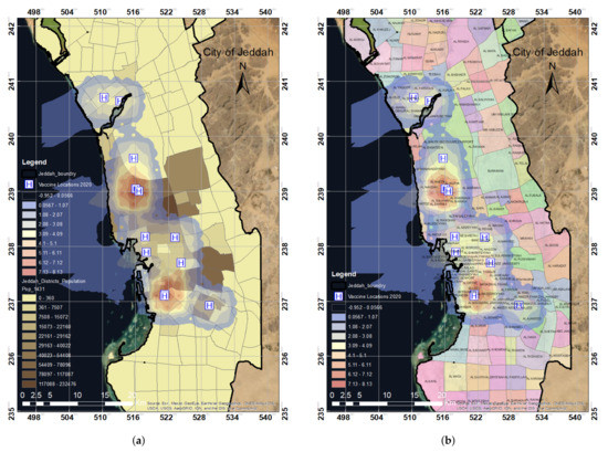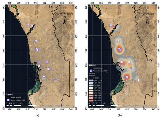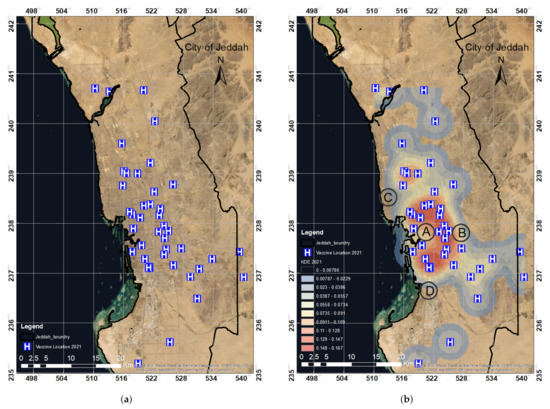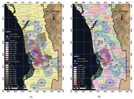 Faisal, K.; Alshammari, S.; Alotaibi, R.; Alhothali, A.; Bamasag, O.; Alghanmi, N.; Bin Yamin, M. Spatial Analysis of COVID-19 Vaccine Centers Distribution: A Case Study of the City of Jeddah, Saudi Arabia. Int. J. Environ. Res. Public Health 2022, 19, 3526. https://doi.org/10.3390/ijerph19063526