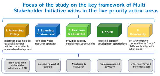 Five priority action areas of ESD (Authors edited and adopted from UNESCO: https://www.oneplanetnetwork.org/sites/default/files/esd_for_2030_one_pager_english.pdf) (accessed on 12 March 2022).