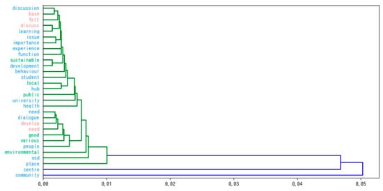 The proximity (similarity) between words/clusters when grouping clusters is determined by the position of the vertical lines grouping the clusters: the further to the left, the closer; the further to the right, the further away. This figure shows that the clusters are concentrated on the left-hand side of the graph; the trends are relatively similar, and the students interviewed are in general agreement that they perceive ESD in a similar way and that they evaluate ESD and social education facilities as activity sites according to generally agreed values. The colours of the hierarchical clustering tree diagram provide an intuitive picture of students’ attitudes, as similar words are grouped together in the same colour.