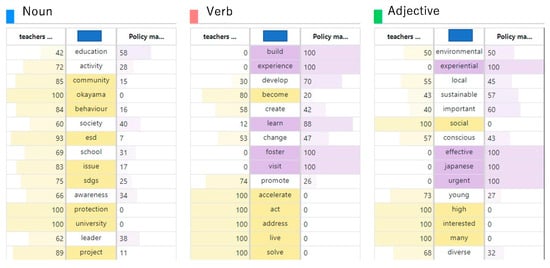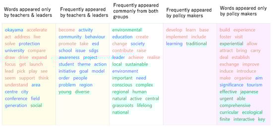 Figure 9 shows a comparison of the frequency of the utterance words in both sides. From Figure 10, the different interests and behavioural principles of the two groups can be clearly seen. In particular, the adjectives that appear frequently in the statements of the two groups show that policy-makers are more interested in how to embed ESD in environmental issues, which are urgent issues for Japan as a whole, from a higher perspective, and how to link them to concrete implementation plans.