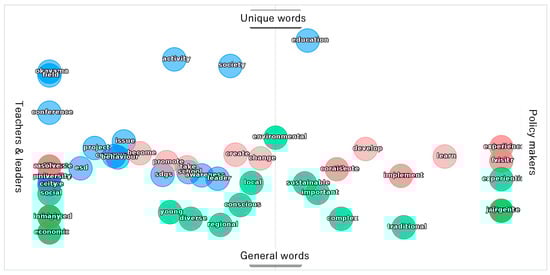 Although both teachers and ESD policy-makers have the responsibility of guiding students in ESD practice, there are interesting differences in what they say, as shown in Figure 8. In other words, the teachers, who are closer to the students, are more focused on helping them understand the environmental problems of their communities and the importance of environmentally conscious behaviour in the context of closer case studies, whereas the policymakers are more concerned with how to translate higher-level concepts, such as the importance of circular economy and ecological values, into ESD initiatives on the ground.
