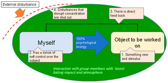 One guidepost for the effects of concentration and arousal in learning is the concept of flow, which has been proposed in the field of social psychology and has been developed and applied in various fields. Flow is one of the factors that contribute to the success of learning situations, and it may be applied to the framework on the induction of environment-oriented behaviors, which is the subject of this study. Originally, flow is described as a state of being ‘in the zone’, which is achieved when the learner is cut off from the external world and concentrates on the task at hand []. In other words, flow theory is argued to be a state produced by being cut off from the outside world, eliminating noise, and concentrating on a single point (Figure 11).