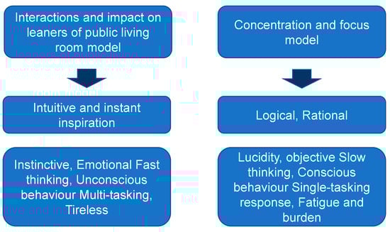 In this section, based on the data obtained and the results of the analysis, we propose a ‘public living room model’ for community learning enhancing people’s environmental awareness and leading to behavioural change. The public living room is important as a place where problems are identified, information is shared, and people decide to change their behaviour. The buzz of the surroundings, the occasional informal chat with the neighbouring teams, and the possibility of new discoveries excited the participants. It is not a silent, laboratory place of learning but rather a place where moderate interaction occurs, and people can work independently and spontaneously on their own projects (Figure 12). The outline of the comparative view indicates that student-led ownership of discussion and activities contribute to mutual learning in enhancing environmental awareness and behaviour change.