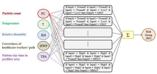 The goal of the FIS is to predict the different grades of severity related to OR’s air quality and, hence, synthesize them on a colored graph for ease of representation. The design of the FIS can be summarized into 3 main stages: fuzzification, inference, and defuzzification. All the designed clinical linguistic variables, membership functions, and rules have been included in a Mamdani FIS [40,41]. The Mamdani linguistic model is built on fuzzy IF-THEN rules where both the preceding and consequent sentences contain linguistic variables (Figure 2). Therefore, it is an intuitive model thanks to its ability to implement human knowledge and human experience into the system, as carried out in this work where the knowledge base is determined from the application of “Guidelines on occupational safety and hygiene standards in the operating department” [42,43].