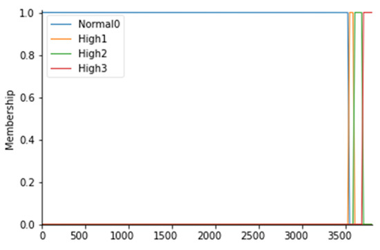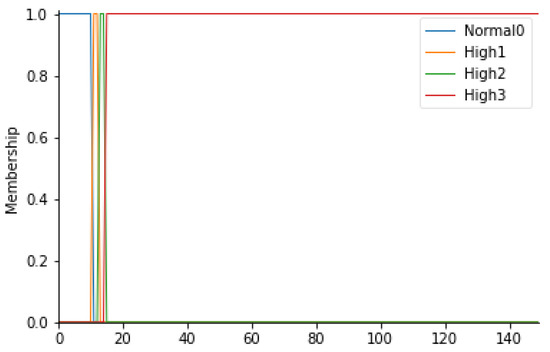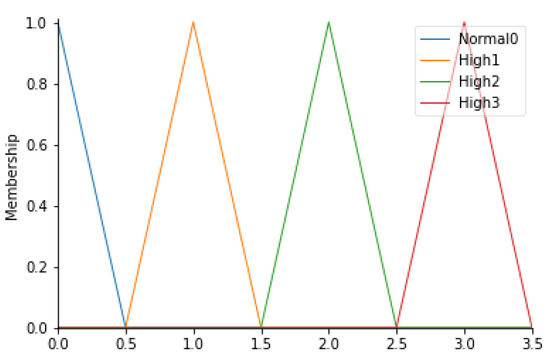 For this parameter, 4 fuzzy sets (Normal0, High1, High2, and High3) have been identified, defined in Table 7. In detail, since these values are an output of an algorithm capable of evaluating the correctness of the path taken by healthcare professionals (HWP), triangular membership functions were considered. Figure 6 shows the corresponding membership functions.