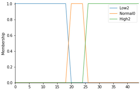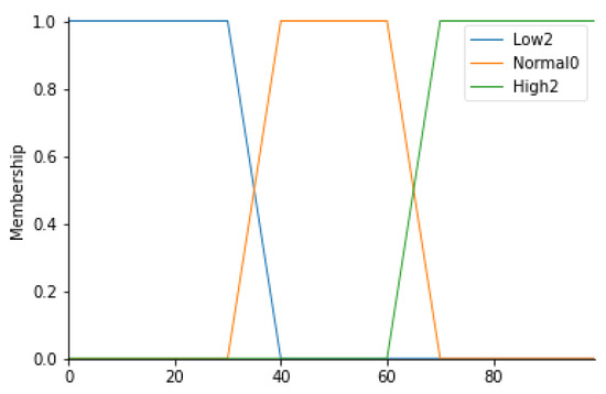 For this input parameter, 3 fuzzy sets have been considered: Low2, Normal0 and High2. The membership functions of the 3 fuzzy sets will be trapezoidal.