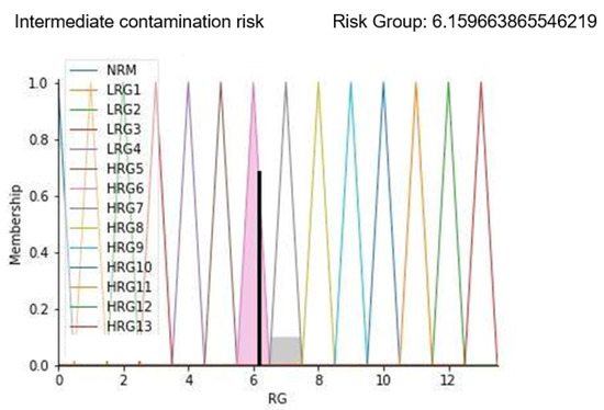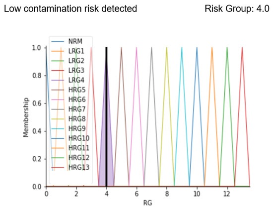 Results in Figure 11 show the membership function of the risk group highlighted with a black line corresponding to the calculated risk level. As can be seen from the displayed alarm, the risk group value is increased to more than 6; this is confirmed by the sentence “Intermediate contamination risk” displayed as a result. On a scale of 13 levels, this predicted value represents an environment with a concrete risk of contamination that could degenerate if timely corrective actions are not applied.