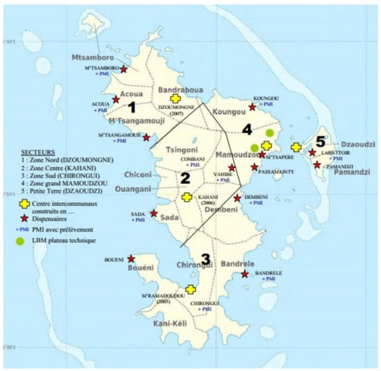 Mayotte’s precarious situation has led to the need to “catch up” in terms of healthcare [,]. Chronic diseases are more frequent than in mainland France, as is overall perinatal and maternal mortality []. In addition, life expectancy is about 8 years lower for women and 5 years lower for men []. The infrastructures in place rely almost exclusively on the public finances of the French state. They are primarily designed to deal with emergencies []. The available healthcare is based on a network of 14 public dispensaries, 4 inter-communal hospitals, 21 maternal and child protection centres and the Mayotte Hospital in Mamoudzou (Figure 1). The primary care sector is very poorly developed, with, for example, 10 times fewer private general practitioners (GPs) than in mainland France [].
