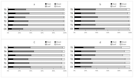Cadmium accumulation in the roots, stems, leaves, and grains of Huayu 23 and Huayu 20. (a) Huayu 23 with high cadmium pollution; (b) Huayu 20 with high cadmium pollution; (c) Huayu 23 with low cadmium pollution; (d) Huayu 20 with low cadmium pollution.