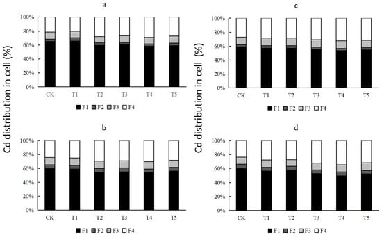 Subcellular distribution of cadmium in the leaves of Huayu 23 and Huayu 20. (a) Huayu 23 with high cadmium pollution; (b) Huayu 23 with low cadmium pollution; (c) Huayu 20 with high cadmium pollution; (d) Huayu 20 with low cadmium pollution. F1, F2, F3 and F4 are components of the cell wall, cell nucleus and chloroplast, mitochondria, and soluble cytoplasm, respectively.