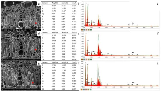 The red dots in the figure represent the selection points for energy spectrum analysis, and the leaf mesophyll cells were selected for the three treatments. In the mesophyll cells, the relative mass of carbon accounts for approximately 50%, followed by oxygen and nitrogen. In the CK group (Figure 3b), the relative masses and atomic weights of Cd were higher than those of Se, and the ratio of the relative amount of substance of Cd to Se was 1.29. Following the addition of Se, the relative amount of Se increased, while that of Cd decreased. The relative amount of substance ratios of Cd and Se in T4 (Figure 3e) and T2 treatments (Figure 3h) decreased to 0.42 and 0.67, respectively. When compared with CK, foliar Se increased the relative quality of the trace elements magnesium (Mg) and silicon (Si) in the mesophyll cells, while soil Se increased the relative quality of Mg, Si, sulphur (S) and iron (Fe).